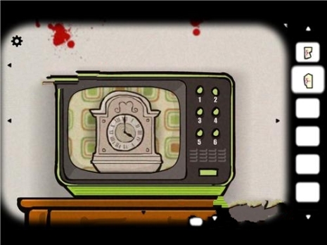 我们向右转,来到了火炉室,发现火炉竟然已经是烧的了,这下更恐怖了,明明没人啊。这时候我们更需要淡定,点开墙上的备忘板,可以发现纸片下有一片相片碎片,往下看,发现有一台电视,但是点开花屏貌似没有什么用。到这里为止,许多小伙伴可能就觉得这房间没什么可以探索了,可是,最关键的就在电视上,点开电视,发现电视的换台可以用,分别对应了数字,你按到4还是3的时候,电视就有画面了,都是显示的有关于数字的画面,我们只要按照他的画面提示,不停地换对应数字的台就好,最后就能取得方块啦!
