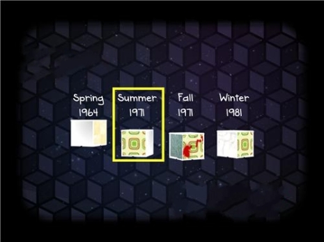 点开游戏,有四个方块选择季节,然而我们只能选择第一个,春季,至于这个为什么季节可以选择,小编会在冬季篇结束进行说明哦。游戏开始,故事显示,这次的事件发生在1964年春季,接着,我们来到了一间只有四面墙的单间房间里面,每一面都能点击箭头进行上下左右的转向。