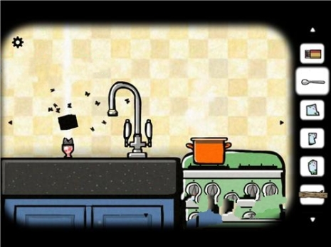 我们回到厨房,把锅装满水,调整一下旁边的煤气开关,用火柴点着火,再把锅放上去,水就会煮沸了,那颗蛋就能毫无顾虑的丢进去了,再拿出来,就显示的是煮熟的蛋了,此时你可以看到水龙头旁边有一个专门装蛋的架子,蛋放上去,用勺子敲碎壳,这时候!方块就出现了!点击多次,取得方块!