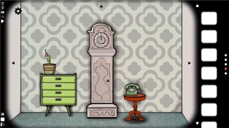 我们依然先是默认的面对有大型钟的这面,在盆栽柜子上拿到望远镜,然后一直点击盆栽,就发现一直手深了出来,又缩了回去,可以拿到第一篇相框碎片。抽屉里面可以取得螺丝刀,火柴,柜子边上还有一片碎片,房间钟的上方也可以取得一片碎片。