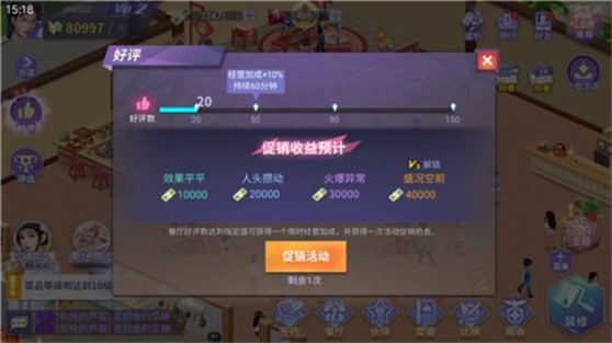 餐厅食物精美、招待热情,就会收到食客的好评哟,看到他们的点赞了吗?这都是他们的心意,点击就可以收取好评,好评达到一定数量可以为餐厅带来加成增益,且根据好评数量有不同的增益等级,还等什么,大拇指点起来吧!