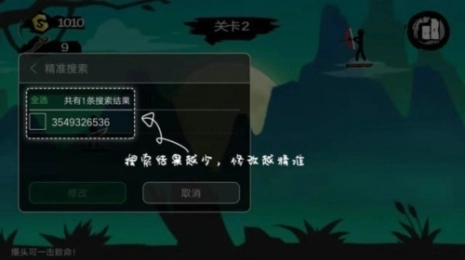 启动游戏后,确定想修改的游戏数值(比如游戏A,当前金币为1000),点击“悬浮框-精准搜索”,输入数值“1000”,点击搜索按钮,如搜索结果不为0,请点击“返回游戏”,体验游戏使金币发生变化,比如变为1010,接着重新点击悬浮框,将数值“1010”输入,系统会检索前后发生变化的数据,如搜索结果不为O,您可以点击“查看”,针对数据进行修改,或者重复返回游戏让金币变化后再搜索结果更加精准哦。