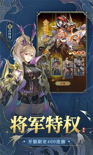 游戏开启后,玩家持续参与活动玩法,将能获得400抽武将任选,春节再送1000抽,将军可根据阵容需要,随心选择,一次抽个爽!!自选橙将,搭建满配阵容,多流派策略智斗。