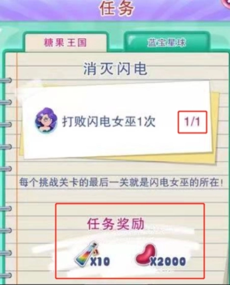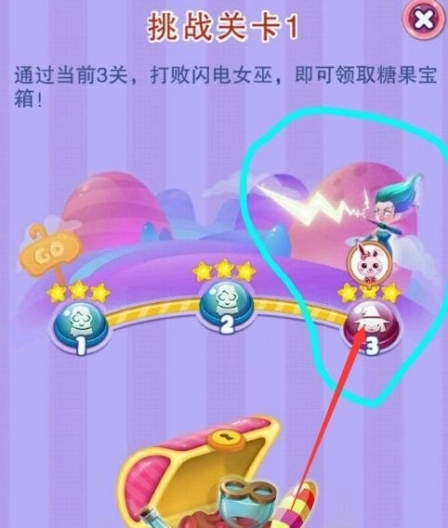 玩家在游戏界面可以发现一个一个英文牌子,点击英文牌子:然后会发现里面有3个关卡,第3个关卡就是闪电女巫,只要通关第3个关卡,闪电女巫就可以通过了。通关后,可以获得相应奖励。打开手机上的游戏进入第五关界面,首先找到游戏最下排的两个特效互相消除;然后在把红色框出来的图形消除形成新的特效;然后火箭特效和刚刚合成的特效在互相消除;最后所有的颜色自动消除就直接通关了。本关BOSS难度还挺大,需要消掉62块水晶糖,而本关的水晶糖都是需要连消两次才能消掉。