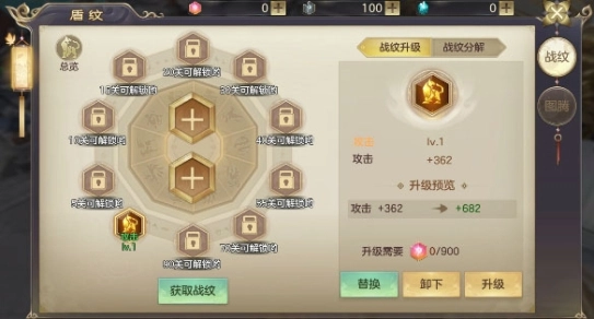 战纹升级:可消耗战纹精华升级战纹,提高属性,战纹精华可通过战纹卷轴和分解战纹获得。
