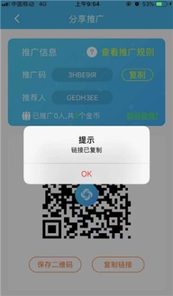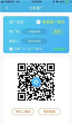 2、然后可以看到分享推广的界面,可以查看推广的具体规则,有自己的推广码和推荐人,下面还有一个推广的二维码,我们想要推广的话可以有两种方式,第一种是保存这个二维码,然后分享给自己的好友,好友通过扫描二维码下载了旋风加速器并且使用后你就可以获得推广的人数和推广的金币。