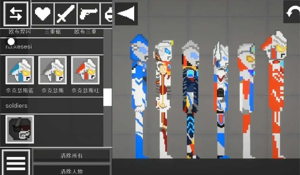4、这里有不同的人物、武器、炸弹、刀剑、注射器、装甲等等资源供玩家们体验;