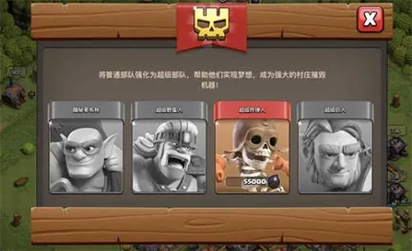 要训练超级部队,大本营需要达到11级。点击商人帐篷旁新出现的超级部队建筑,然后选择想要强化的部队。一次只能强化一种部队!部队强化后,训练部队时可以看到已强化的普通部队的图标变成了超级部队图标(红色背景、头像超炫)。强化有效期为一周,在强化失效前启用的超级部队会替代对应的普通部队。