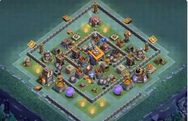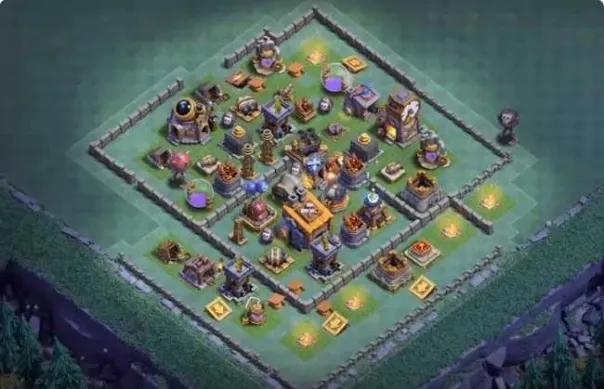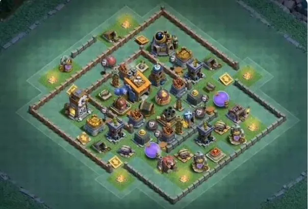 中规中矩的8本阵型,在中心有足够的防空火力,对空军流和女巫流非常克制。但阵型上方比较开阔,遇到会玩的高等级野蛮人炮车流比较容易被推两星,所以可以优先升级阵型上半部区域的双管、箭塔、超级特斯拉等高伤害防御缓解压力