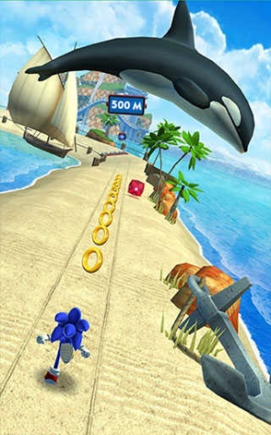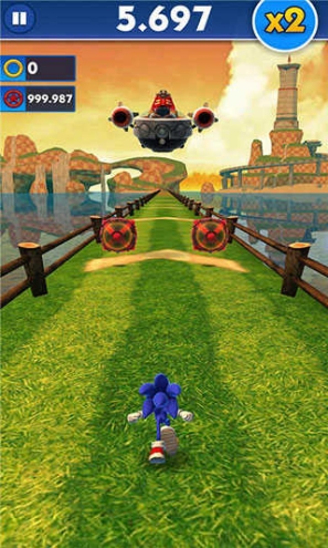 索尼克冲刺有许多动作游戏的元素,其中之一是有时可以在半空中踩到“机械鱼”,利用它的反弹力跳过沟渠。这种机会出现时,游戏会有光圈对准机械鱼给出提示,新手都会误以为必须点中才行,其实你只需按一下屏幕就能连跳。