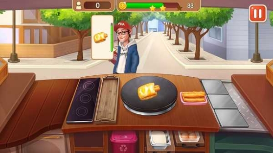 最开始只能制作最简单的煎饼,连薄脆和生菜都不加。制作的过程很简单,只要按照顺序点击材料,不论是摊开面糊还是抹匀鸡蛋,这些都不用玩家去操作。按照客人需求完成料理,再点击餐品便会自动递交到客人的手中(漂浮在客人身旁的思想漂浮框)。
