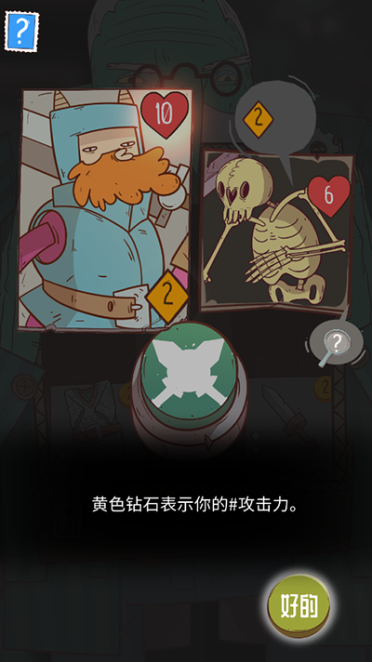 5、点击不同类型的卡牌会触发不同事件。点击怪物卡牌会触发战斗,心形和菱形图标分别表示你与对手的剩余生命值和攻击力。点击下方绿色按钮开始回合制战斗。