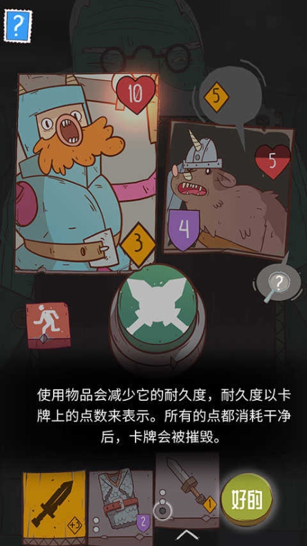 7、收集到的卡牌具备耐久度,使用物品会减少它的耐久度,耐久度以卡牌上的点数来表示。所有的点都消耗干净后,卡牌会被摧毁。