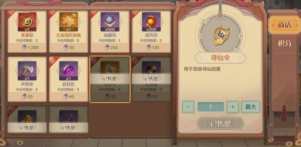 购买突破丹500、寻仙令2个、尘务录5张、珍禽腿2个。