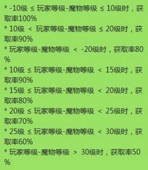 当魔物的等级与自己的 Base 等级相差在 ±30 级,魔物掉率为100%;等级差超过31级时,掉率只有正常收益的 90%,当等级差超过 41级时,掉率只有正常收益的 80%。