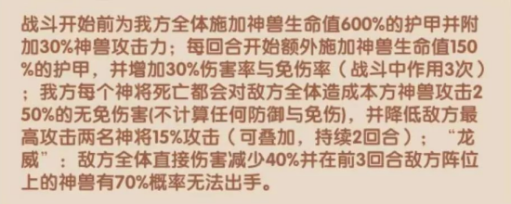 ◆ 此外,应龙的神威咆哮还具有特殊Buff“龙威”,在降低敌方全体的直接伤害的同时还能有较高概率阻止对手神兽出手,由此增加阵容的容错率。
