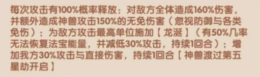 ◆ 首先应龙的技能会为我方全体增加神兽的百分比攻击(神兽在战斗中的攻击为神兽与攻击最高将面板攻击之和),能够大大提升我方整体的战斗能力。尤其对于多核阵容,群体攻击增加带来的增伤收益非常之高。