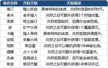 然后就是和伙伴们共狩的这个关键了。和伙伴共狩会获得狩猎经验,有些还能获得特别的道具。有些是狩猎纹章,有些是魔晶原石,有些是甜甜浆果,还有可能是星星币。前五个部落的伙伴们的共狩天赋小编给大家整理好啦,没有和他们结下羁绊的赶紧拉!