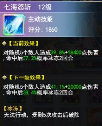 主动技能七海怒斩(12级):对随机5个敌人造成39.8%+18400点伤害,命中后37.2%概率冰冻2回合