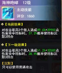 主动技能海神咆哮(12级):对攻击最高3个敌人造成49.6%+29900伤害命中目标时,37.2%概率使目标沉默3回合