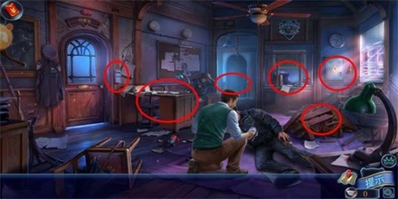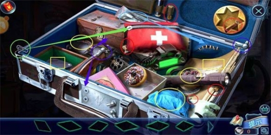 4、根据钥匙图找出钥匙串上的钥匙,打开证据柜得到“锯子”。用锯子去切开木板堆,拿到手提箱,玩东西小游戏,全部小游戏过完得到“指纹采集工具箱”。