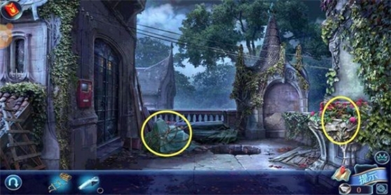 4、继续返回场景2露台,用凿子和锤子砸开墙壁上的土,用手套拾取“嵌片”,还有一个“把手”。这时候场景2露台上的全部线索搜完了,还剩一个场景1汽车里面特殊的按钮。