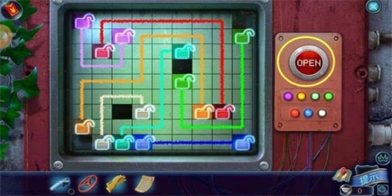 8、打开电线杆上的配电箱用2个保险丝使电力恢复,返回场景2的露台点击门边上的开门器,玩连线小游戏。
