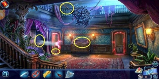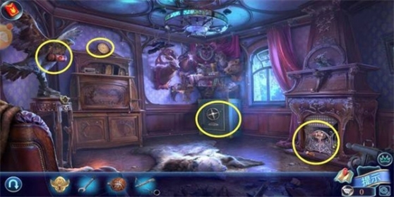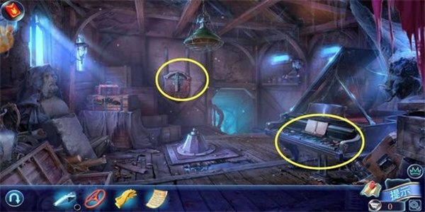 1、点击钢琴,放上乐谱,按提示按下相对应的琴键,钢琴差一个踏板。退出画面,发现墙壁盾牌下面的暗格打开,得到“油壶”。回到场景2用油取下杂物堆的“螺丝刀”,再继续返回场景1用螺丝刀取下小木屋的“徽章”。