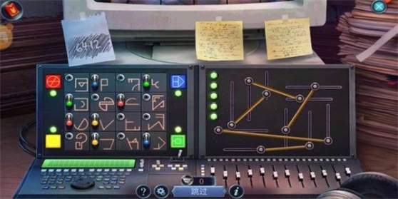 3、用卷笔刀削铅笔,然后拿着铅笔返回上一场景的值班室窗口描出“电脑密码6412”撕下来,去档案室打开电脑,玩小游戏,右边小游戏(图1):移动线条,使他们全部不交叉(这个应该是有好几种解法的,我玩两次,两次不一样);左边小游戏(图1):根据四个角上的提示,把灯放在相应的图上;拼图(图2),太快了,截屏没截好,最后几张换下位置就行。