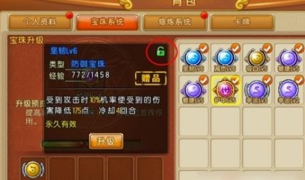 4、点击宝珠后效果显示的右上角会出现锁定按钮,再点击宝珠可以对宝珠进行锁定/解锁操作。宝珠锁定以后可以进行升级,但是不可以被合成和批量合成。