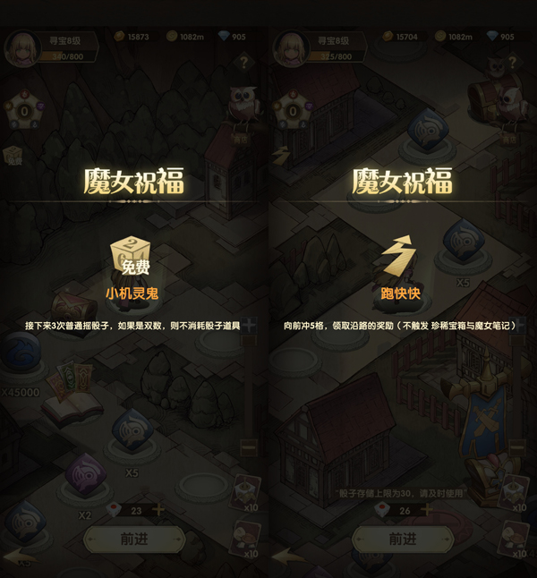 1、“跑快快”:向前冲5格,领取沿路的奖励(不触发珍稀宝箱和幸运女神);