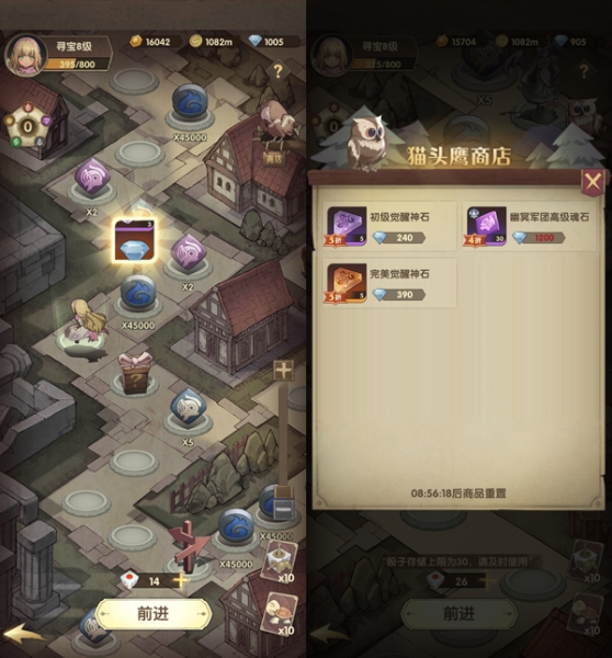 在地图中行走,偶尔会遇到猫头鹰商店,在商店里,猫头鹰老板会给路过的玩家提供折扣商品,在猫头鹰商店里,玩家经常可以淘到闪烁星尘、英雄经验、魂石碎片和种族召唤卡等道具。而且,当离开猫头鹰商店时,没有购买的道具会被保存到右上角的商店中,直至第2天早上5点清空道具。