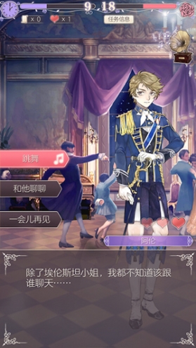 3、普通舞会每天刷新的时间为上午的 9点、12点,下午的3点,晚上的7点及10点。在舞会中,玩家可进行闲逛与闲聊。闲逛可触发舞会中的各种事件,闲聊可增加人物的好感度。