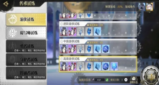 每个职业都有所需的传承试炼材料,在每周的不同时段开启,周日统一开启,这里有一个多获取材料的办法,假如今天开的是游侠试炼,你需要大量游侠的天赋点,那么可以将队伍配置为全游侠,类似这样。