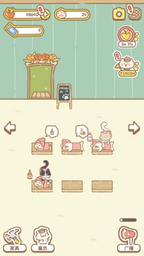 通过广播的推广形式,便可为你的按摩店吸引顾客,在迎接第一位顾客的到来后,如果没有员工,则会失去这位顾客,进而影响你的收入,现在在他们离开之前,你的赶快雇佣一位新的员工来帮助猫咪顾客按摩。