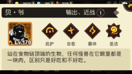 技能评价:贝爷引以为傲的神技,如果你的队伍里面没有封印技能的怪兽,那贝爷在受击回血的状态下很难被推倒。并且作为七大王之一,自带高阶圣洁纹章,一个怪兽的封印技能还不限制不了它。