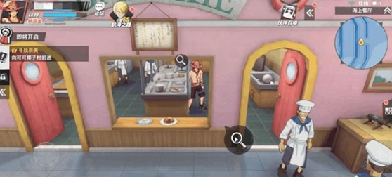 ①玩家在进入到【海上餐厅】的二楼的厨房时,当玩家走进时(如上图的位置)会在画面出现【放大镜】标识,玩家点击后就可以调查并且能获得【藏宝图碎片*2】的奖励。