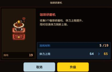 功能:使用咖啡研磨机,收集满5个可增加1点最大体力值,并使体力恢复至满。(请确保在此之前体力已耗尽)