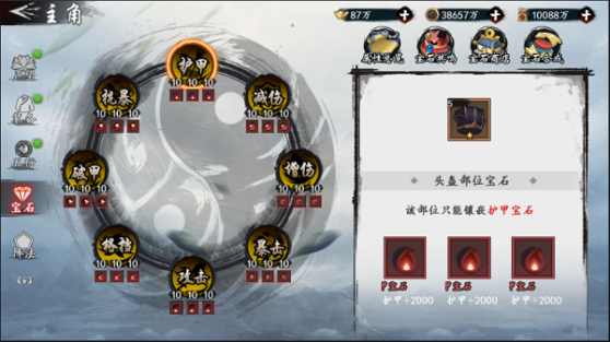 宝石系统里也有8种对应不同属性加成的宝石,分别是:护甲、减伤、增伤、暴击、攻击、格挡、破甲、抗暴。每种宝石也相对应着装备里的不同部位: