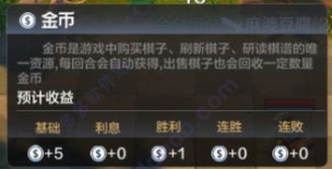 回合收入:回合基础收入+利息收入+连胜奖励/连败补偿 组成了你每回合能够获得的金币。利息收入即你结束回合时的金币的10%。利息收入最高为5,所以当你的金币囤积超过50后,尽量把这些富余的金币转化为你的棋子