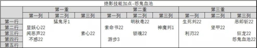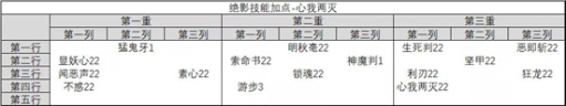 加点说明:技能加点神魔判只点1,因为点满伤害不高且容易躲,1级只用来触发标记和回血。放弃伏法令,主要是技能范围小且同样容易躲,而且学了封神技能后,绝影是不缺伤害技能的。不过这套加点标记容易溢出,多学个伏法令也可以。