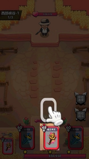 首先进入游戏会有新手引导,通过拖动卡牌到指定位置,可以使用武器卡牌,如图: