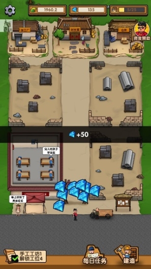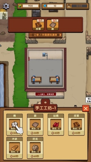 根据前期的新手引导,进入工坊,在这里你可以选择产品类型,如图所示,选择完成后,工人们便开始了产品的加工。