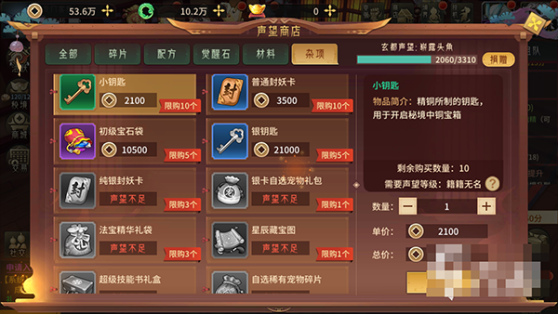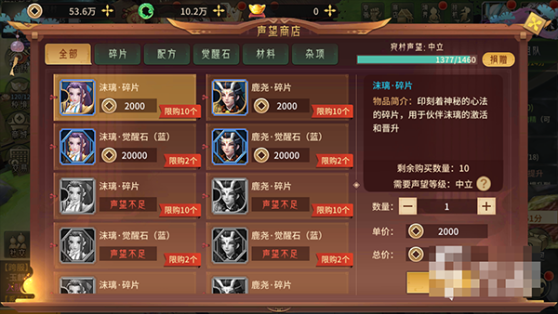 第一个推荐的是伙伴碎片,在战斗中伙伴的作用就不用小编多说了吧,实力对于队伍提升是很大的。而伙伴晋升中会消耗很多的碎片,在声望商店中就有大量的伙伴碎片出售,大家根据自己的培养伙伴来选择就可以了。不过要注意,一些高级伙伴兑换是要声望等级的,所以日常的任务也要做好。