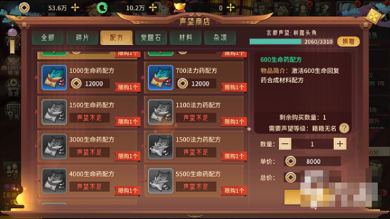 第三个推荐的是各种药品的配方,这个道具可以说就只有在声望商店中来获得了。在部分的特殊战斗中,战斗之后是不会恢复血量的,使用一些药品就可以带来不错的恢复,可以帮助玩家保持好血量继续投入到战斗中。
