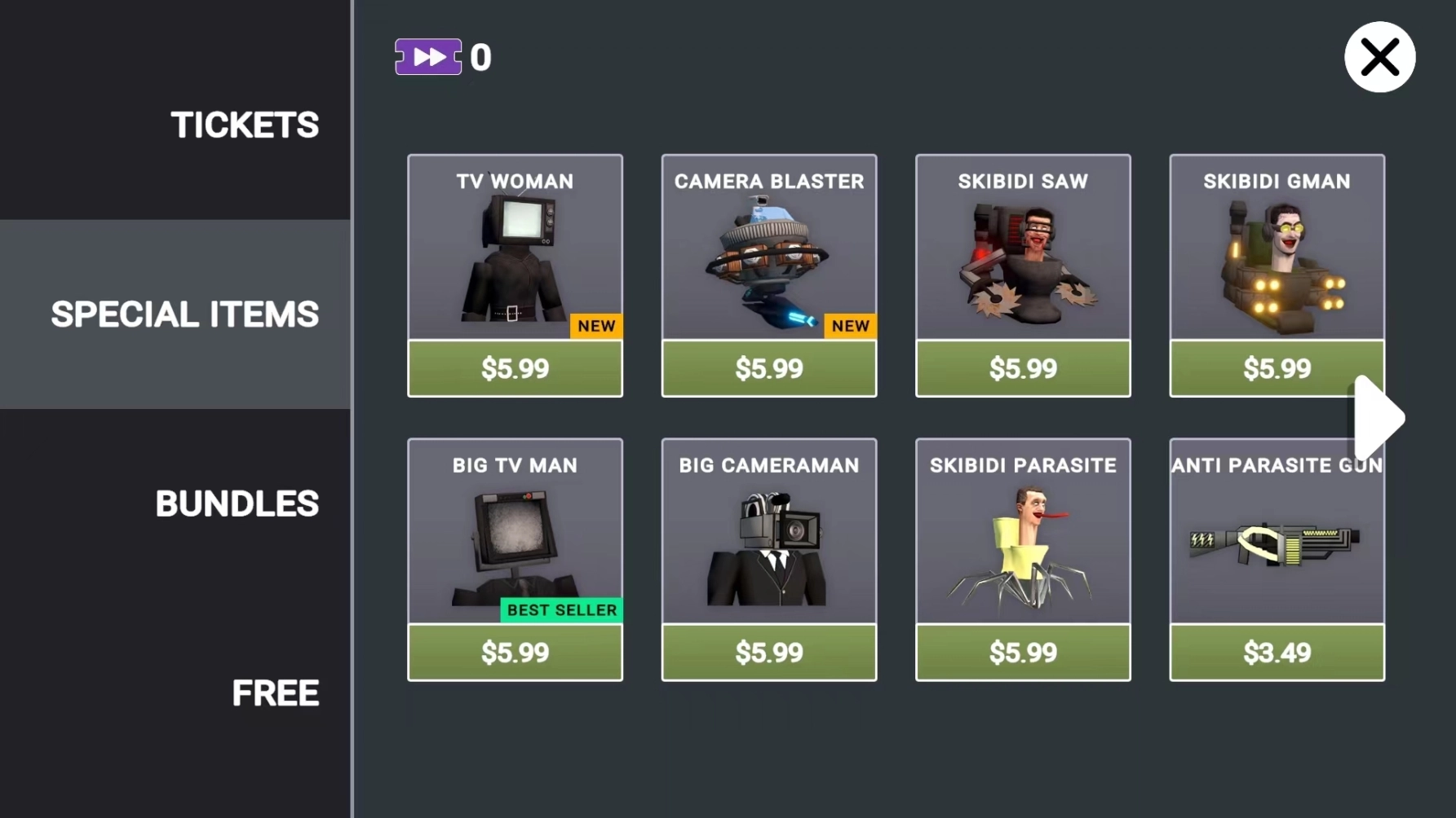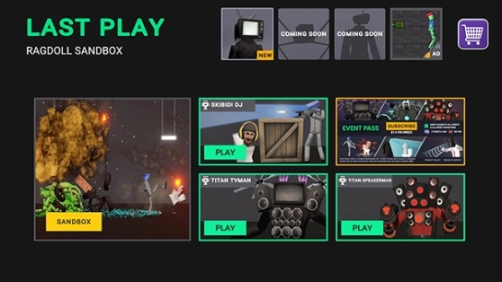 1、打开Last Play最新版,进入游戏主界面,可看到包括【SANDBOX】沙盒模式、【SKIBIDI DJ】、【TITAN TVMAN】和【TITAN SPEAKERMAN】四种游戏模式,