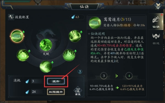 拥有了一套完整的技能后,在每一次升级仙阶,都会获得仙诀点,可以使用仙诀点,提升技能等级。