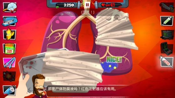 这一关终于用不到锤子了,直接用刀子,切割肠子中有红色颜色更深一点的部分