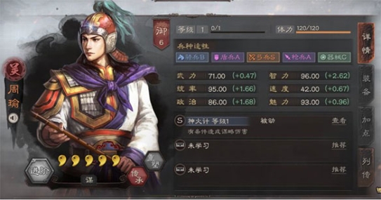 从周瑜的战法来看,周瑜就适合带较高发动率的主动战法,或者可能你会灵机一动发现这样一个战法,可以考虑是否合适(当然这里只是举个例子,实际上白眉并不适合周瑜)。