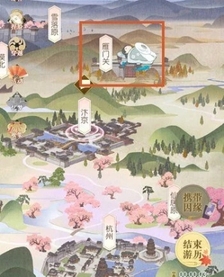 2、开始游历后,在江湖地图中可以看到一个躺着睡觉的小人待在某个地图中,点击她所在的地图进入游历场景